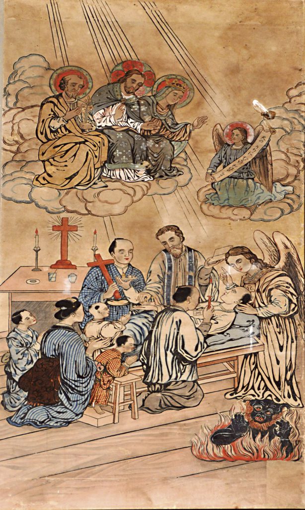 本HPの背景は、ド・ロ神父の主導した木版彩色画「善人の最期」(天草市の大江天主堂蔵)である。1878年〜1879年の作成と推定される。天使の手持ち幡の「天のうちに むくいハ おほき なり」という言葉は、本画のモデル「善終」(ヴァスール原画、土山湾工房木版制作)になかったものである。これは「マタイによる福音」のイエズスの「山上の垂訓」を引用し、キリスト教信仰のために迫害された人々を「善人」と表現する芸術である。